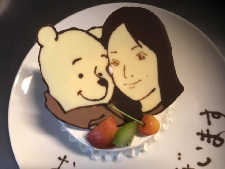 先日お作りした似顔絵ケーキです☆ お誕生日や記念日、送別会に歓迎会…様々なサプライズがありますが… 当店の似顔絵ケーキは感動率100%を誇っていますよ♪ 今回は、お客様のご要望にお応えいたしまして…主役の方がくまのプーさんがお好きとのことでしたので、一緒に描かせていただきましたよ!!
